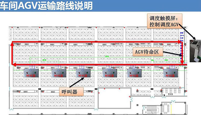 1.紅色環形路線為AGV運行路線,車間路線采用環形路線,避免兩臺車行走路線沖突;